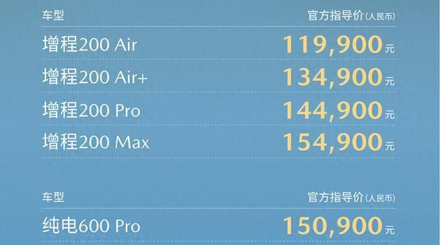 动力方面,新车将提供增程和纯电两种动力,其中增程车型搭载1.5L增程器,纯电续航里程最高200km,最大综合续航1301km;纯电车型CLTC续航里程最高600km。